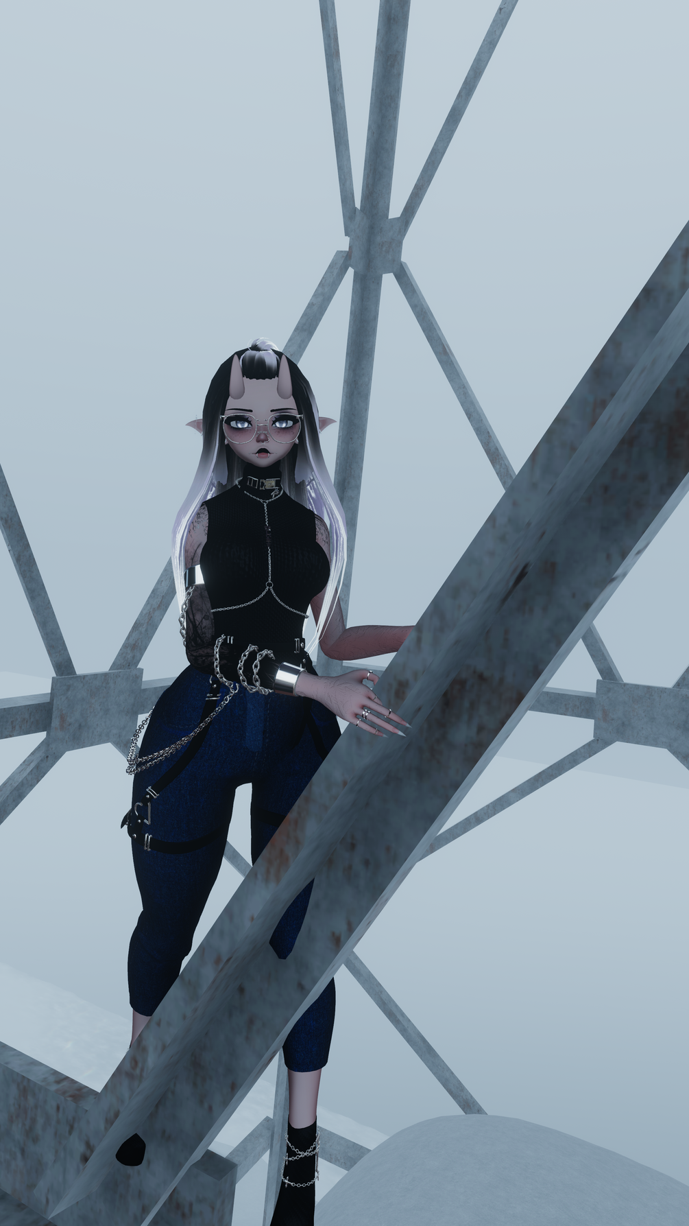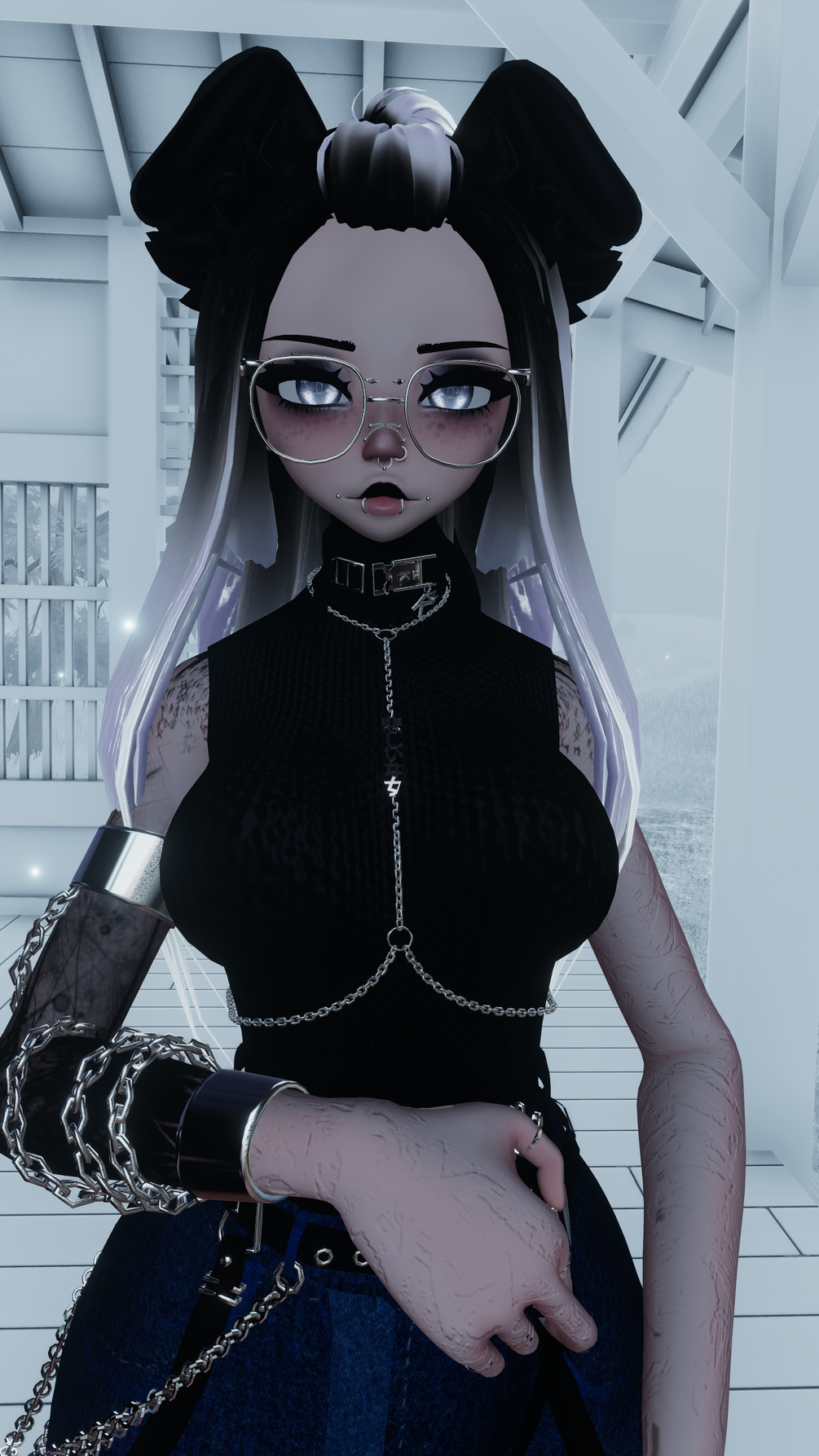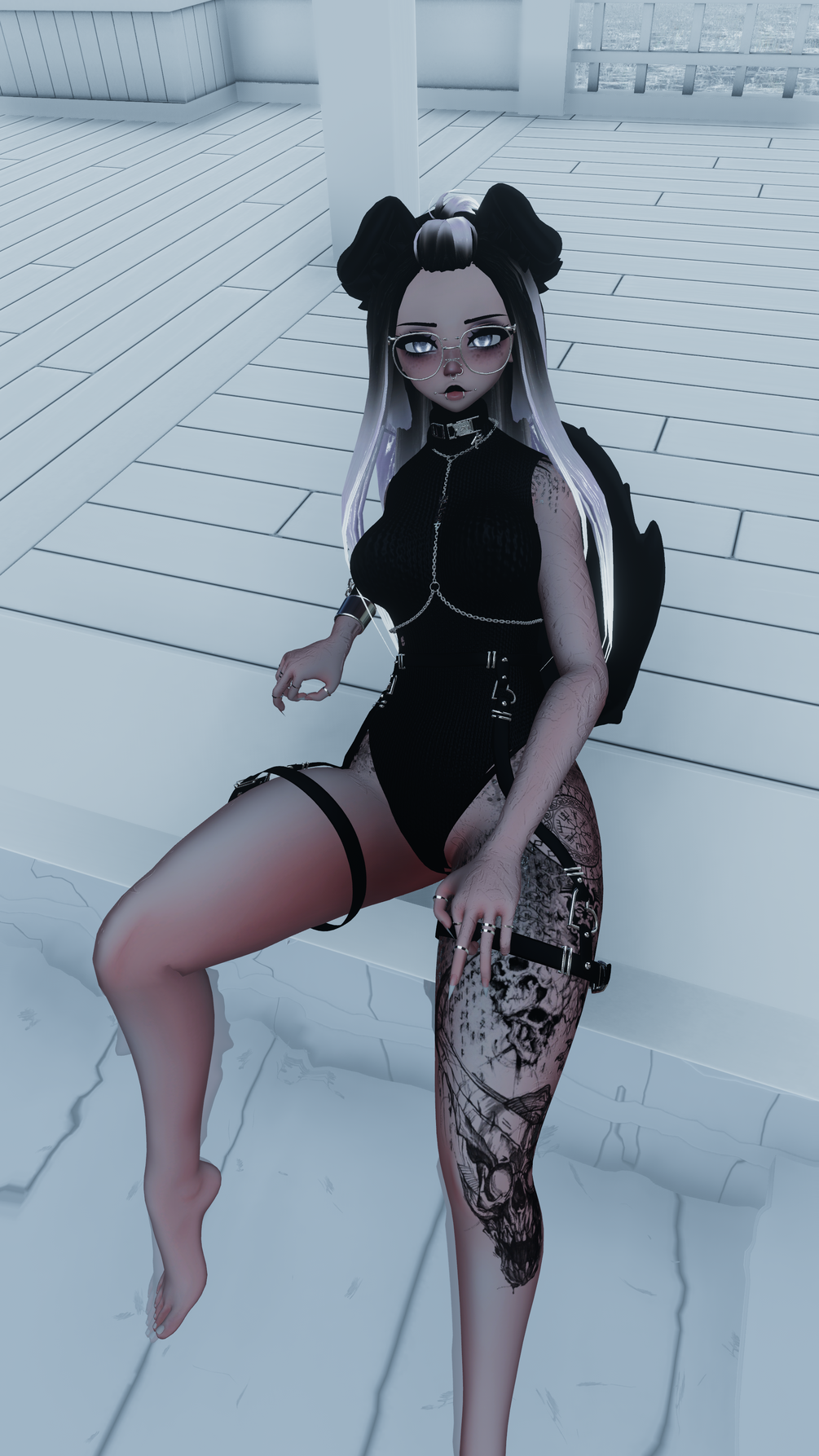 ↣ Accessories include glasses, choker, nipple piercings, chest harness, arm chain, rings, and fishnets